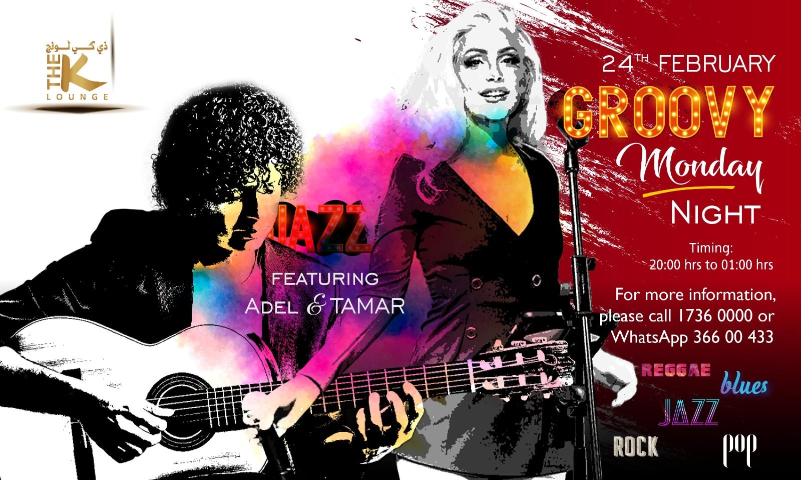 Enjoy a musical night featuring Adel and Tamar this Monday, on 24th of February at The K Lounge from 8 PM onwards. For more details, please call on : +973 17360000 or WhatsApp +973 36600433.